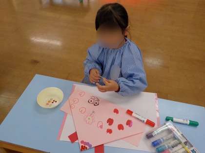 さくら組の子どもたちは、先生がつくってくれたカブトにペンでお絵かきをしたり、シールをぺたぺた貼ったりしました。「色んな色のシール貼りたい」「かっこいいカブトにする」と思いを伝えながら楽しんで製作しました。つくったカブトを嬉しそうにかぶって先生や友達に見せてくれました。