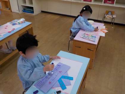あやめ組の子どもたちは、2枚の画用紙を使って自分でカブトを折りました。先生に折り方を教えてもらいながら自分の力でカブトをつくり、絵をかきました。「全部自分でつくったんだよ」と満足そうにカブトをかぶって見せてくれました。