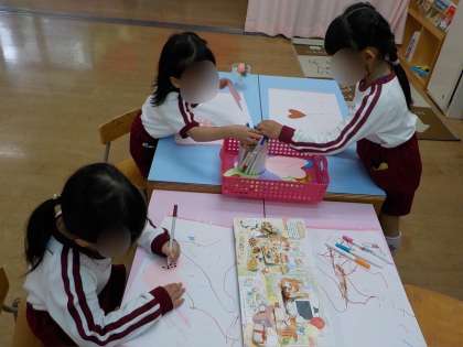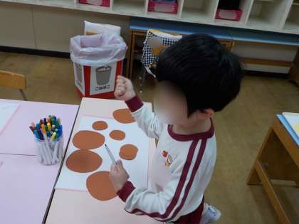 「これはチョコチップクッキー」「大っきいクッキー」と嬉しそうにつくってました。クッキーの出てくる絵本を見て様々な形や味があることに気付き、「先生、今度はイチゴ味のクッキーつくりたい」「ウサギの形のクッキーもつくる」とどんどんイメージを広げて、美味しいクッキーをたくさんつくりました!