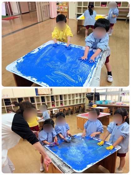 はじめての絵の具を使った活動。少しドキドキしながら絵の具に指つけ、「冷たい」「べたっとしてるね」と絵の具の感触を知った子どもたちは段々楽しくなり、「もっと触りたい」と腕を大きく動かして絵の具を広げる姿が見られました。「楽しい」「気持ちいい」と嬉しそうに絵の具で遊んだり、色の混ざりを楽しんだりしていました。