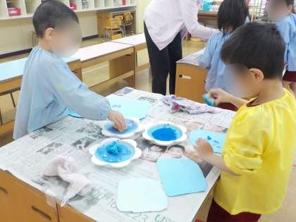 今回はハサミを使って四角い画用紙を丸の形に切ることに挑戦しました!連続切り、角切りと様々な切り方を経験してきた子どもたちは、段々ハサミの使い方が上手になってきました♪「自分でチョキチョキして丸く切れた!」「もう一回やりたい」と挑戦する姿や自信を持って取り組む姿が見られました。そして、丸く切った画用紙にスポンジのスタンプでペッタン!「スタンプ楽しい」「アジサイのお花と同じ形だ」と活動を楽しみ、ピンクや青、紫と素敵なアジサイができました。