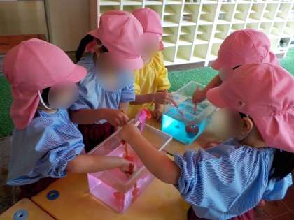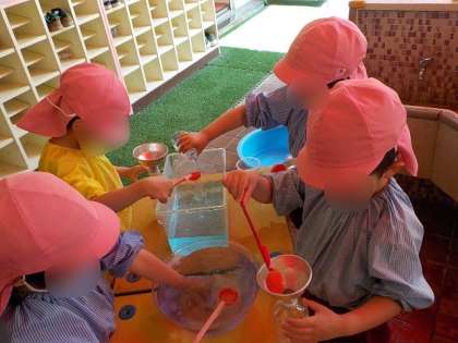 「お水気持ちいいね」「明日もやりたい!」と色水への関心を高め、水の感触や色の変化を楽しむことができました。