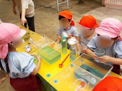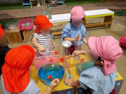 「美味しそうな色だけど飲んじゃダメだよ!」と色水遊びをするときの約束事を知らせたり、「こうやって使うんだよ」と漏瑚を使ってペットボトルに色水を入れる方法を教えてあげたりしていました!「ジュースどうぞ」「冷たくて気持ちいい」と水の感触を楽しんでいました♪