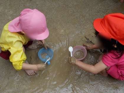 そして、水遊びをしていると、地面に水溜りができ、園庭の土がトロトロになっていくことに気がつきました!「チョコレートだ」「トロトロしてる」と嬉しそうに泥に手をつけたり、容器にためたりして遊ぶ姿も見られました。