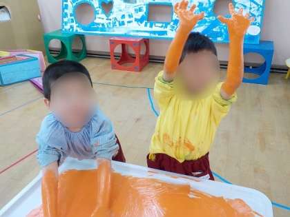 前回よりもダナミックに絵の具を広げ、「気持ちいい!」と腕まで絵の具まみれになって楽しんでいました!お友達と絵の具のついた手を見せ合いながら「楽しいね〜」「もっとやろ!」と満足そうにしていました。