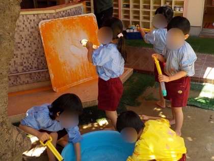 最後に指で絵をかき、みんなで絵に向かって水鉄砲遊びを楽しみました!「黄色オバケをやっつけるぞー!」「どんどん消えていった」と絵の具をめがけて水鉄砲を発射♪お片付けまで楽しむ子どもたちでした!