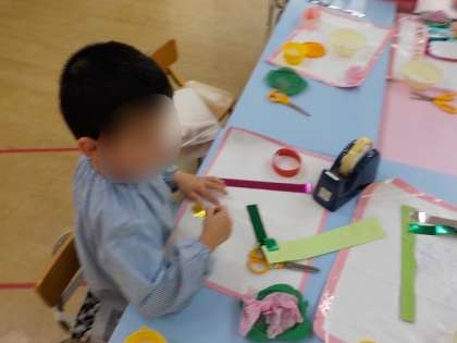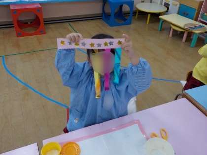 細長く切った画用紙に星をいっぱい貼り、好きな色のキラキラのテープを選んでセロハンテープでくっつけました♪色合いを考えながらつくり、「キラキラいっぱいのできた」「見てみて」と満足そうにしていました。