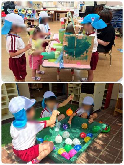 各クラス、的当てやワニワニパニック等、遊びを考えて、みんなでつくったり、準備をしたりして、夏まつりを楽しみにしていました。今日は、お店の人とお客さんに交代で分かれて楽しみました。