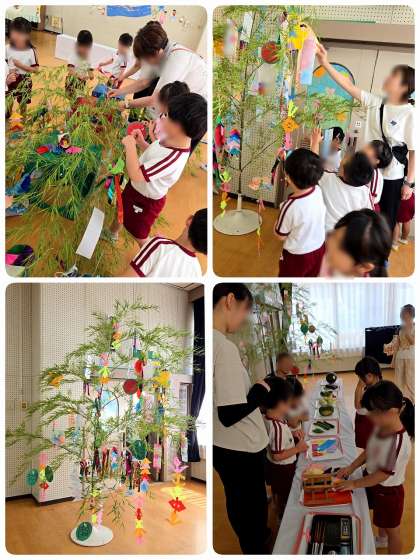 七夕遊びでは、幼稚園で収穫した夏野菜や先週金曜日にあやめ組が商店街へ買い物に出かけて購入した野菜、七夕の伝説にまつわるものをお供えしました。