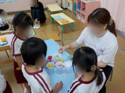 新聞紙にお花紙を巻き、「いちご味のアイスだよ」「ソーダー味もあるんだ」と一つ一つ丁寧にアイスクリームをつくりました。完成したアイスクリームを種類ごとに牛乳パックに入れ、色々な味のアイスクリームの出来上がり♪画用紙でつくったコーンやカップに入れて「アイスクリームどうぞ!」「色んな味が入ってるよ」と友達や先生に嬉しそうにアイスクリームを渡していました。「冷たくて美味しい」「もっといっぱいアイスクリームつくりたい!」と活動を楽しむ子どもたちでした。