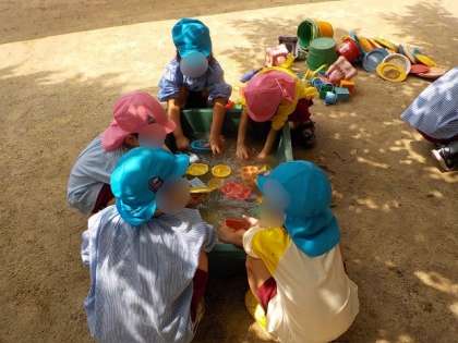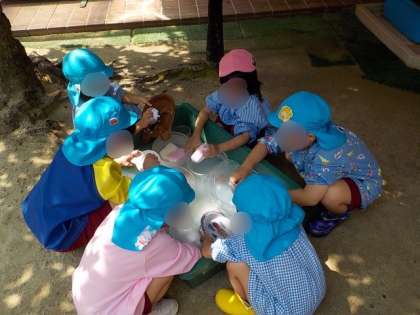 明日は一学期の終業式。夏休みに入る前に、一学期の間たくさん遊んだ砂場や水遊びのおもちゃをみんなで綺麗にしました!