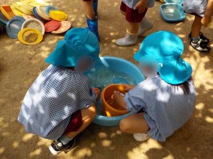 「これでサラサラの砂つくった」「色水のジュースつくるの楽しかった」と活動を振り返りながらおもちゃを洗いをしました。あやめ組の子どもたちは、これまでのおもちゃ洗いを思い出しながら、「こうやってゴシゴシするねんで」とさくら組の友達に教えてあげていました。さくら組の子どもたちは、そのようなお兄さんお姉さんの姿を見ながら丁寧におもちゃを洗っていました。