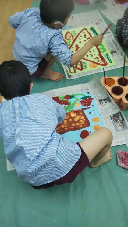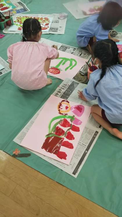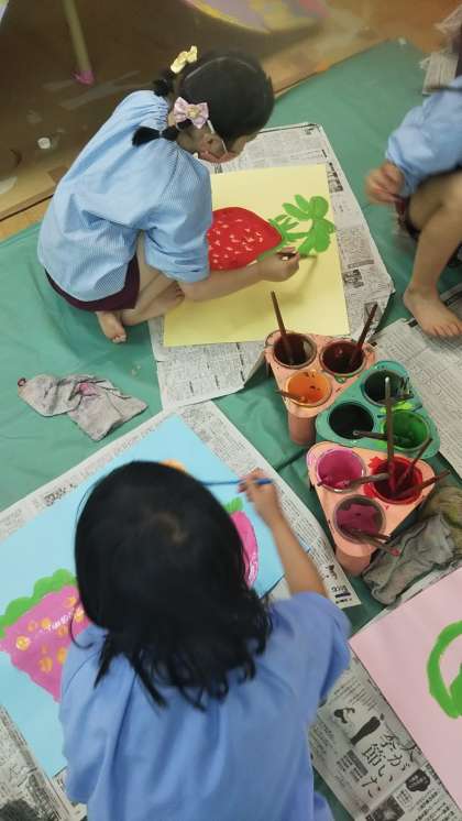 あやめ組さんが絵の具でイチゴをかきました!「いっぱいあったね!」「皆で見に行った!」「葉っぱもかこう!」イチゴの収穫を思い出しながら楽しくかいていました。