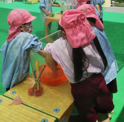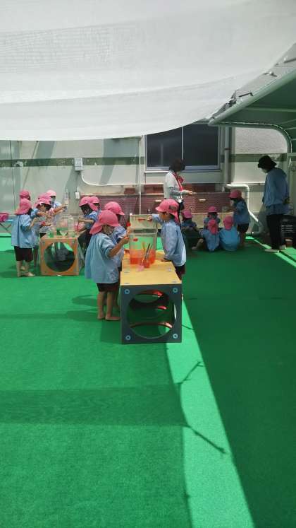そんな素敵な場所で今日はさくら組がジュースやさんで遊んでいます!「ブドウジュースです!」「おいしいのできた!どうぞ!」…楽しいね!気持ちいいね!