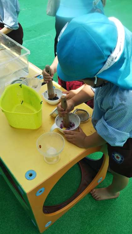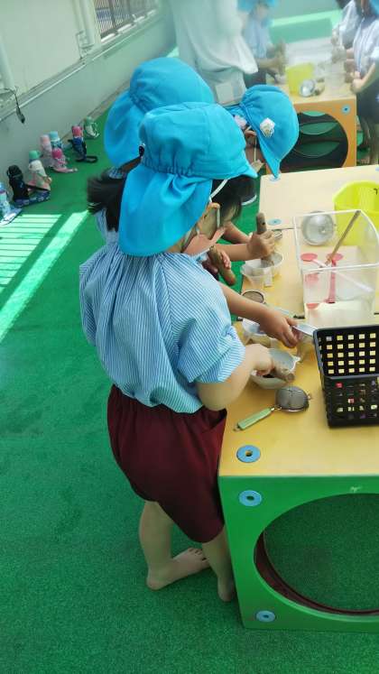 今日もとてもいい天気!あやめ組がお花できれいなジュースを作っていました。「ブドウジュースできた!」「もう少し花いれてみるわ!」「なんかあんこみたいな色になってん…」と沢山お話してくれました。