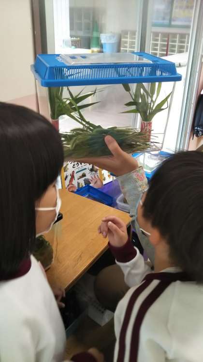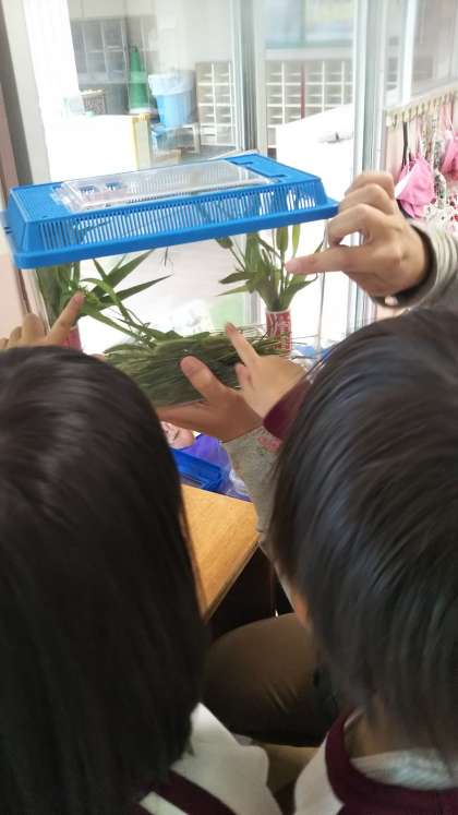 幼稚園にはバッタさんもいます。草とおんなじ色なので「どこにいるのー?」「あ!見つけた!」「ここにもいた!」じ〜っと見つめて発見!うれしいね。