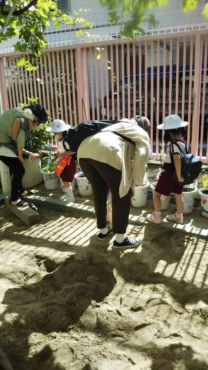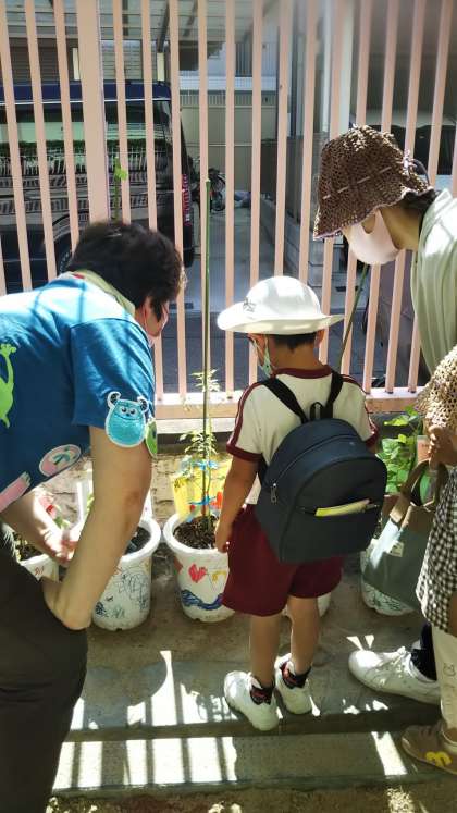 さっそく、おうちの人と一緒に雑草を抜いたり、生長を楽しみにしたりして見ていました。おいしい野菜がはやくできますように!