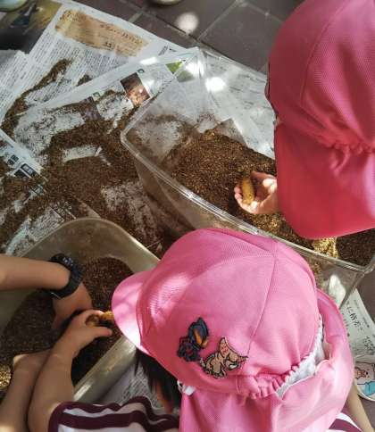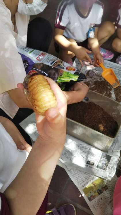 「うわーおっきい!」「めっちゃでっかなってるやん!」とまるまるとした幼虫にビックリの子どもたちでした。