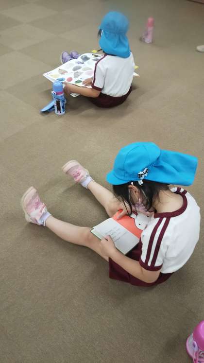 好きな絵本を選んで、多目的室(今回開放してくださいました)で読んでいます。色々な本があるね!