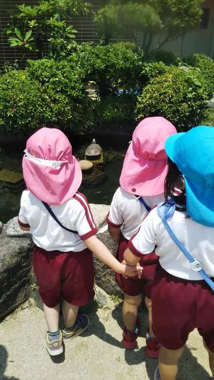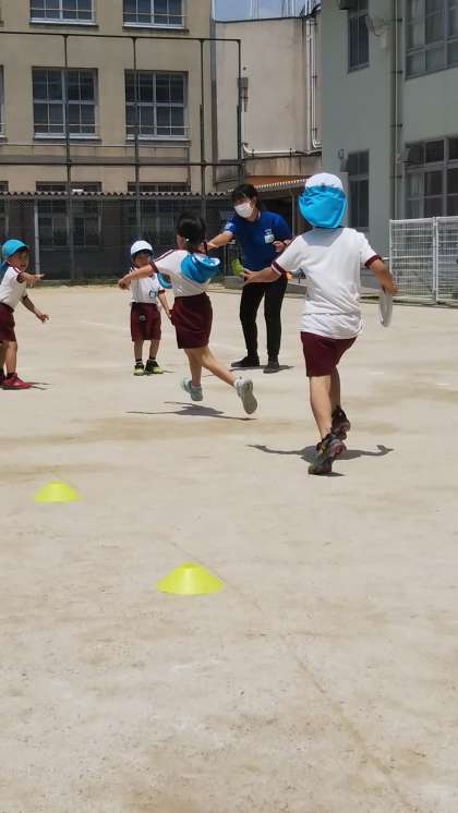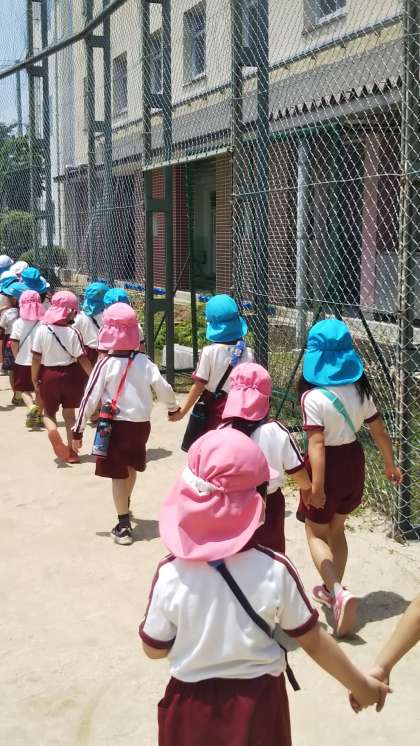 今里小学校に散歩にいきました!今日はさくら組さんも一緒です。一緒に校庭をまわったり、あやめ組がリレーをするのを応援したりしました!