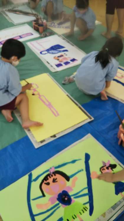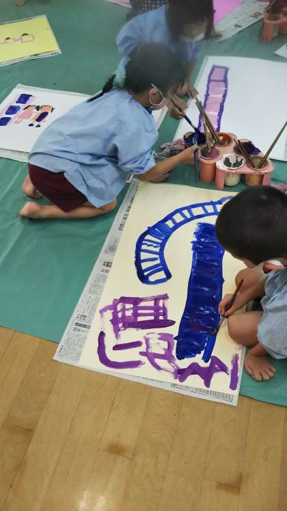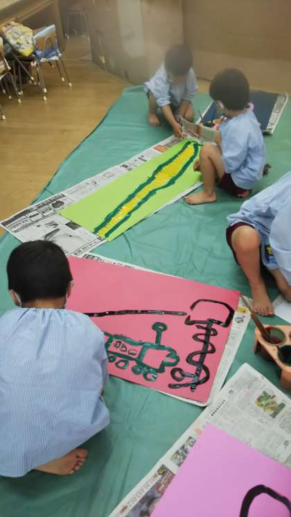 楽しかった公園の滑り台や、ロードトレインを思い出して絵の具で絵をかきました。「滑り台長かった!」「電車(ロードトレイン)みんなで、乗ったなあ!」思いを込めて丁寧にかいていました。