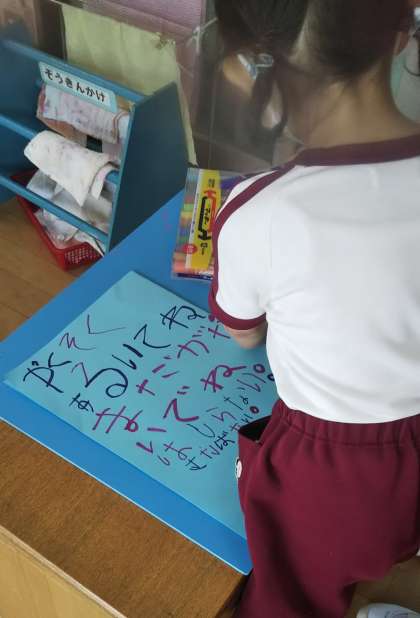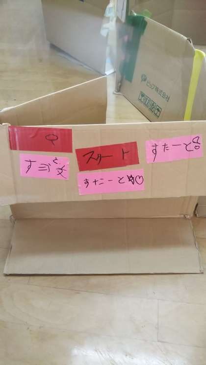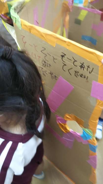 あやめ組の段ボール迷路。よく見ると子どもが書いた注意書きやスタートの表示がありました。守ってほしいことも相談しながら書いていました。みんなで作っている迷路を大事にしている気持ちも伝わりますね!