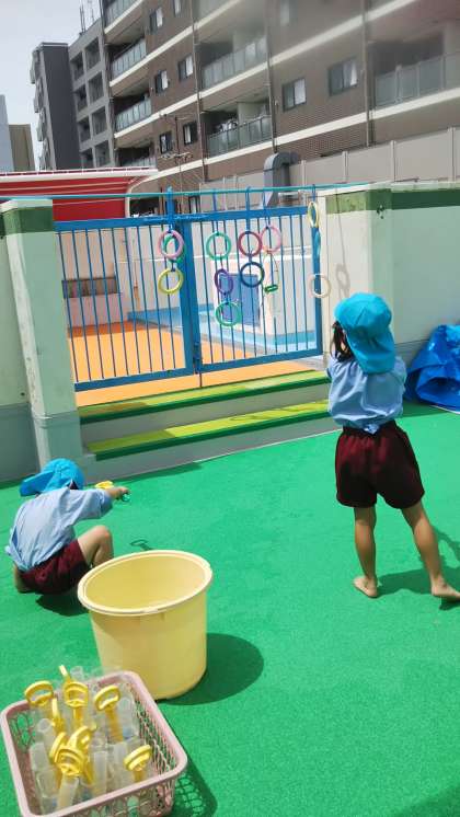 今日もとても暑くなりました。子どもたちは今日も水遊びを楽しんでいます。水でっぽうはよ〜く狙って!