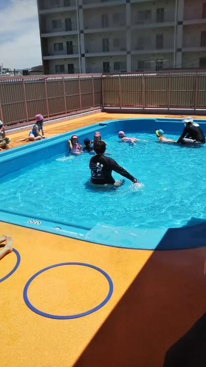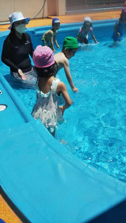 さくら組もドキドキのプール!誰も泣かずに元気いっぱいでした。出たくないなあ。もっと入りたいなあ……これから楽しみですね♪