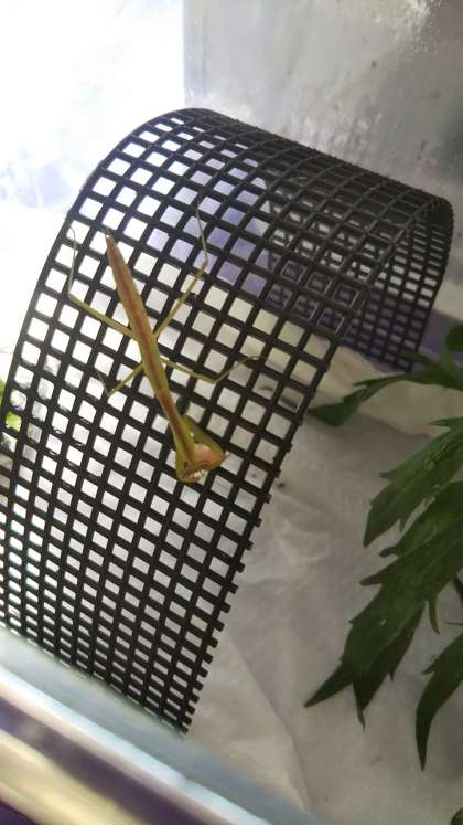 カマキリが脱皮をして更に大きくなりました。 エサ(魚肉ソーセージ)もしっかり食べています。色も少し変わってきたかな?