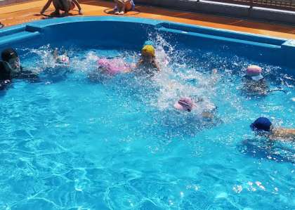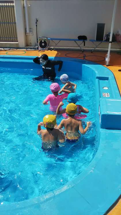 「♪み〜んなでいこう〜♪」とプールを元気に歩いて…「おふろにはい〜ろう〜」「1、2、のざぶん!」で顔までつけている人がいっぱい!びっくりしました。