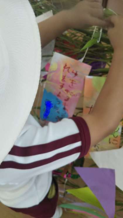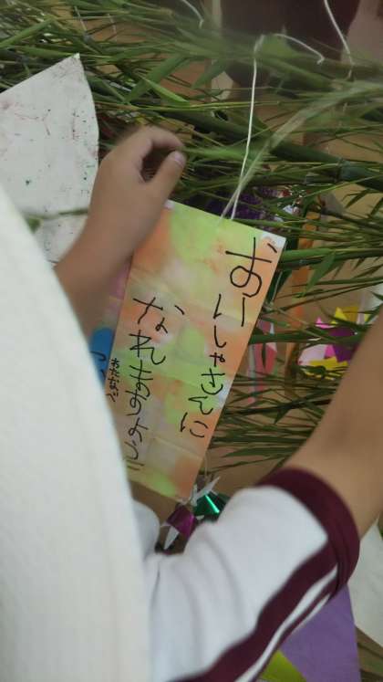 明日は七夕。今日は大きな笹に飾りをつけました。短冊にかいたお願い事叶いますように!