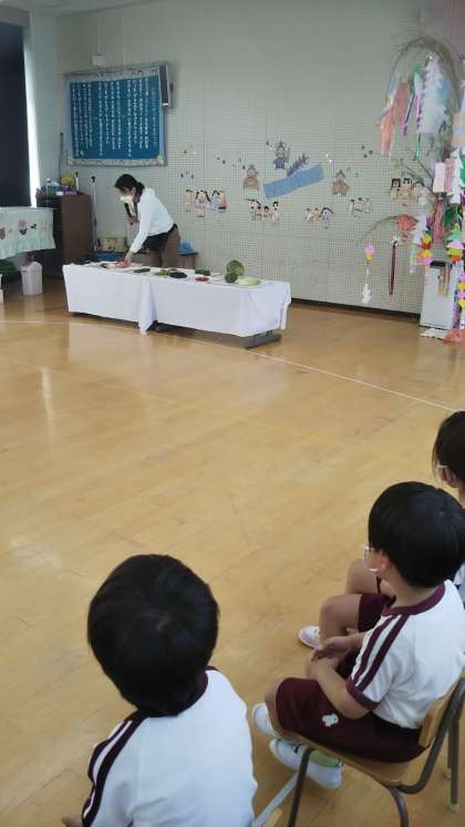 あやめ組がお供えを運んだり、そのお供えの意味を聞いたりしました。先生たちで七夕のお話の劇をしました♪楽しい会になりましたね!今日は作った飾りを持って帰りました。おうちでも飾ってね!