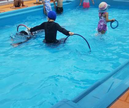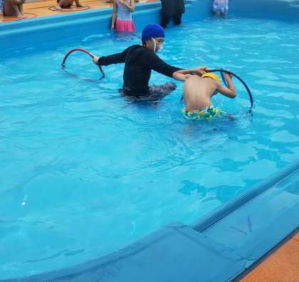 今日は大好きなリレーをプールでもしていました。フープをくぐってバトンをつなごう!がんばれー!