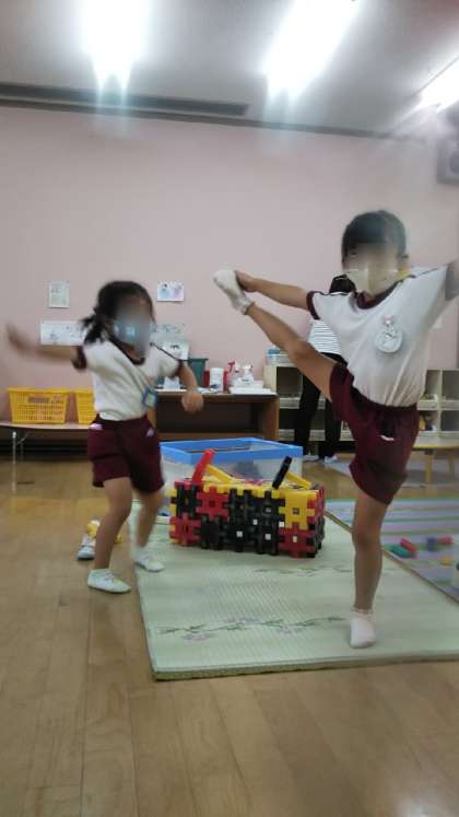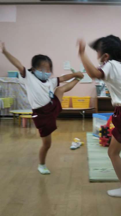 今日のくまちゃんは5時までのお友だちもいます。どうしてるかな?と見に行くと「先生見て!!」「私もできる!」となぜかY字バランスを見せてくれました。なんだかとっても楽しそうでした。