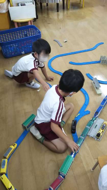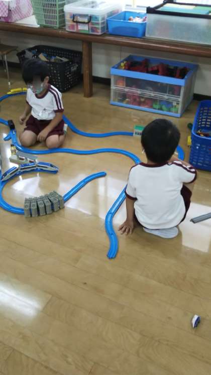 今日は少し雨模様でした。でもお部屋で楽しく遊んでいます。晴れたら園庭にいこうね♪