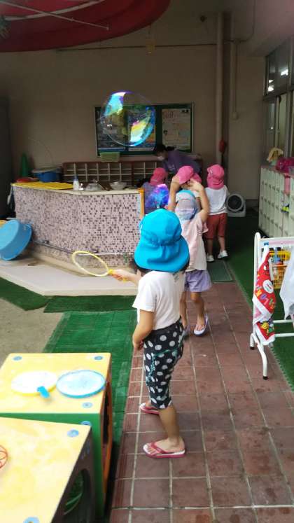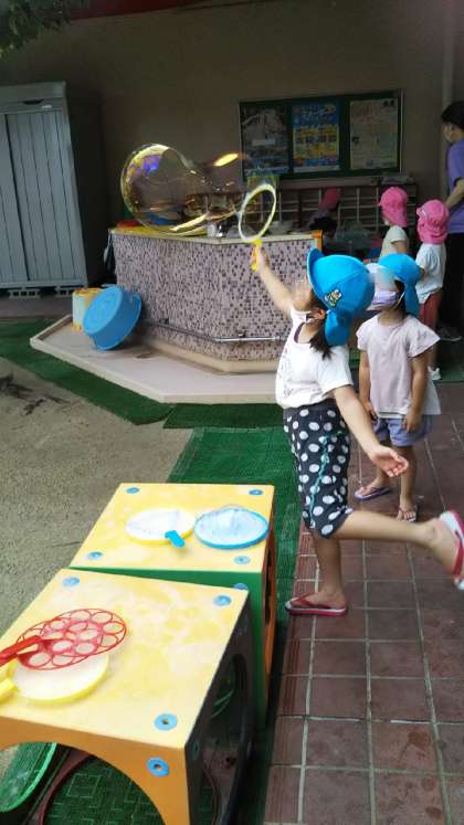 雨がやんだので、今日もテラスで水遊びです。シャボン玉が得意になって大きなシャボン玉をつくっていました。