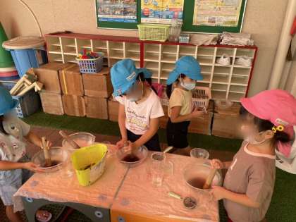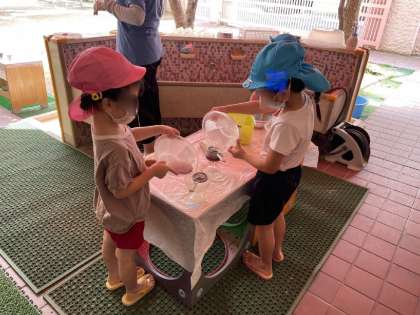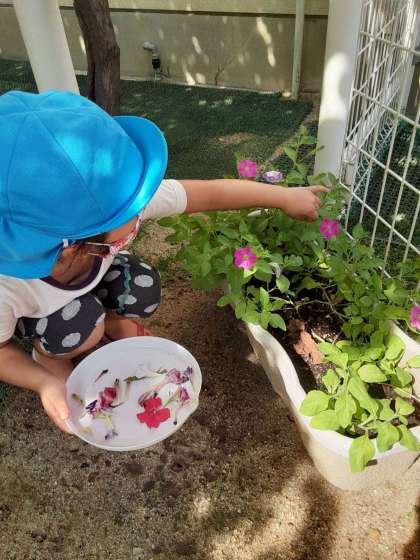 園庭のお花を摘んで今日もジュース作りを楽しんでいます。