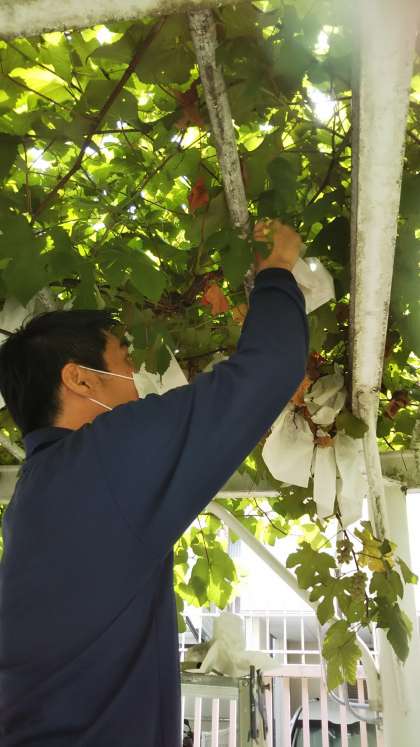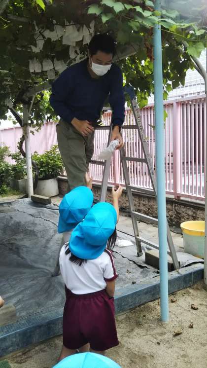 園庭のブドウができました!ちょっと高い場所なので、主事さんが収穫してくださいました。あやめ組が受け取って運びました♪たくさんできたね。甘いかな?
