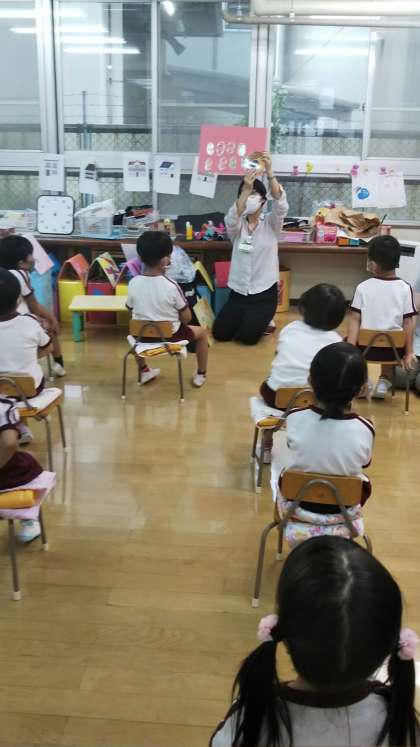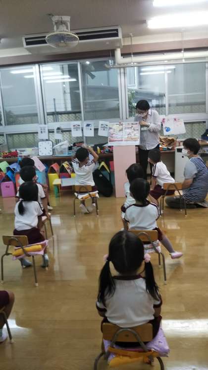 今日は区役所の方がさくら組さんにお話に来てくださいました。おやつの話(お砂糖の話)や体の絵本を読んでくださいました。