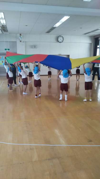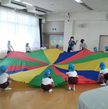 あやめ組がパラバルーンをしています。みんなで気持ちを合わせて 楽しそうですね。