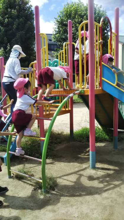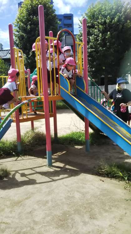かけっこの後は滑り台で遊びました。何回も滑って楽しんだり、海賊船に見立ててごっこ遊びをしたり…楽しそうでした。