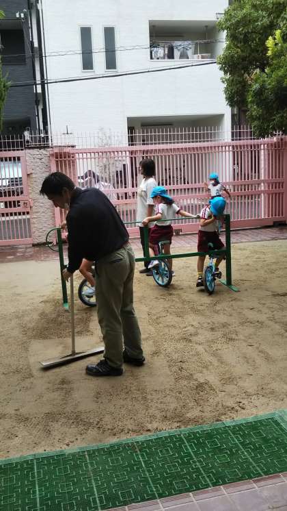 昨晩の雨でお庭が少しでこぼこになっていました。一輪車チャレンジのあやめさんのために主事さんがでこぼこをならして、固めてくださいました。阪神園芸ならぬ今里園芸です!いつもありがとうございます