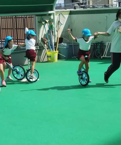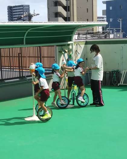今日は屋上で一輪車にチャレンジ!園庭よりもでこぼこがないからやりやすいかな?