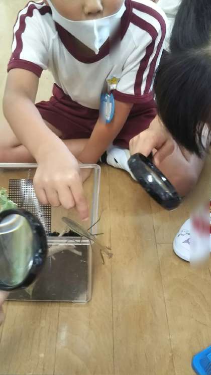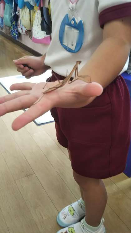 カマキリをさわりたい!とあやめ組。そっと手に乗せて「かわいい!」「歩いてる!」とよく見ていました。大きなカマキリの方はさすがにさわるのはちょっと怖いようでしたが虫めがねで見ながら「大きいな!」「かっこいな」とよく見ていました。