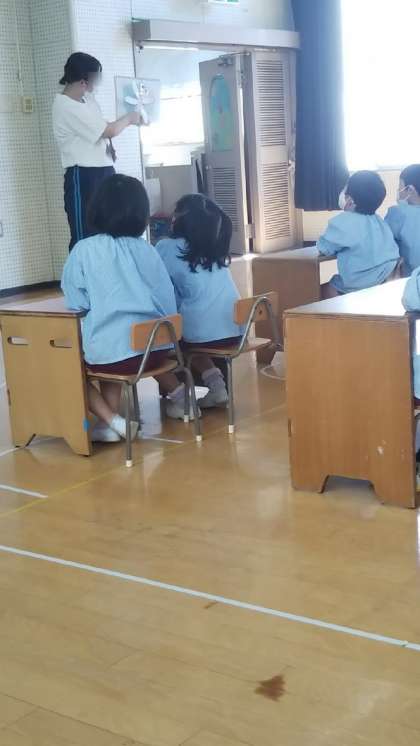 今日はあやめ組の実習生さんの部分実習。トンボを作って、飛ばして遊びました。