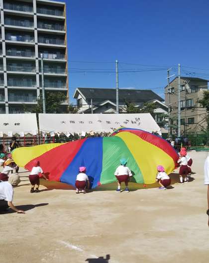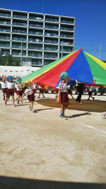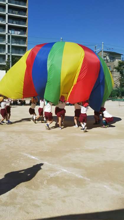 あやめ組はなわや、竹馬、げた、一輪車…と色々なチャレンジを頑張ってきました。最後はみんなでパラバルーンです!青空の下でカラフルなバルーンがきれいでしたね!