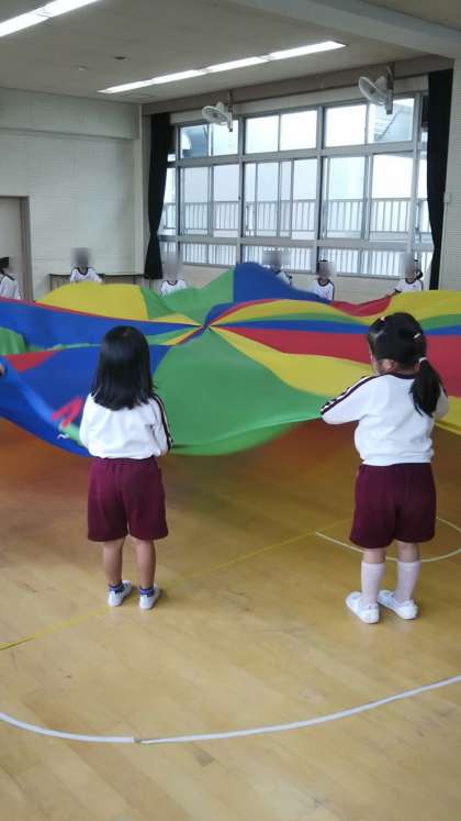 あやめ組が運動会でしていたパラバルーン。貸してもらって、さくら組もチャレンジです!