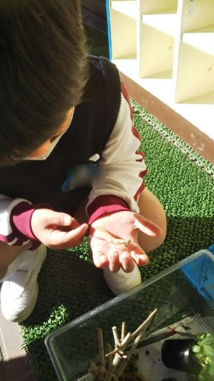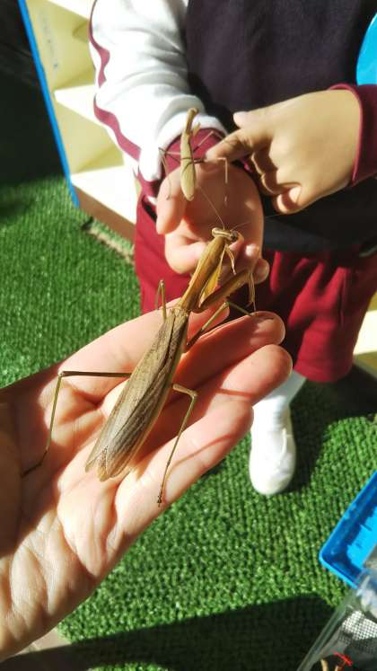 「先生カマキリさわっていい?」と来た子どもたち。「さわってもいいけど大きくなってるよ?怖くない?大丈夫?」と聞くと「うん。大丈夫!」との返事が。大きくなったカマキリを久しぶりに手にのせて観察していました。カマキリの目や、足、かまのギザギザなどよく見ていました!