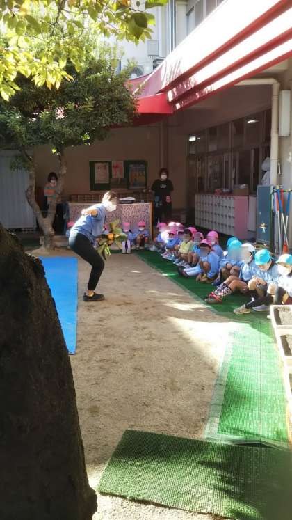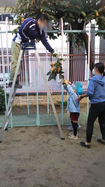 子どもたちは毎日柿が色づくのを楽しみに見ていました。いよいよ今日は柿の収穫です♪