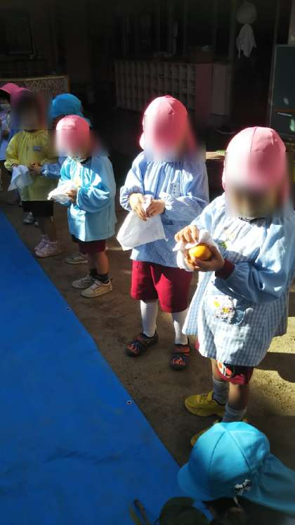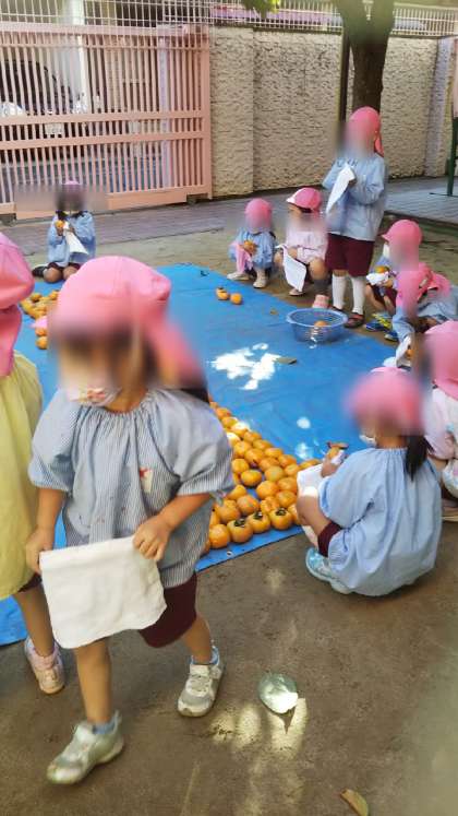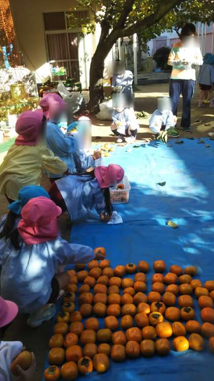あやめ組が枝からはずしてくれた柿をさくら組がピカピカに磨いて並べています。